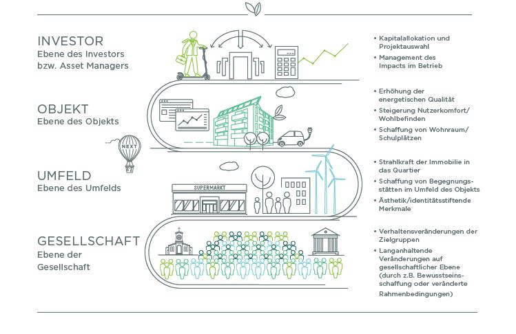 Unser Ansatz des Impact Investing hat das Ziel, einen nettopositiven ökologischen und/oder sozialen Beitrag zu leisten. Nettopositiv bedeutet, dass eine positive Wirkung einer ggf. negativen Wirkung gegenübergestellt wird und auch mögliche nachteilige Nachhaltigkeitsauswirkungen Berücksichtigung finden. Neben der Intention, durch den Ankauf einer Immobilie ganz bewusst eine tatsächliche Wirkung zu erzielen, muss durch den Ankauf ein zusätzlicher Mehrwert geschaffen werden, der ohne das Zutun eines Impact Investors nicht realisiert worden wäre. Darüber hinaus muss der durch den Ankauf erzielte Impact messbar und eindeutig der getätigten Investition zuzuordnen sein. Wichtig ist hervorzuheben, dass eine Immobilie auf diversen Ebenen Wirkung erzielen kann.
