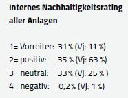 Im vergangenen Jahr haben wir die zur Neuanlage verfügbaren Gelder aus Beiträgen und Fälligkeiten genutzt, um in nachhaltige Unternehmen zu investieren; verbunden mit der Erwartung, eine direktere Wirkung als bei Investitionen in Staaten oder Fonds zu haben. Daneben hat sich unser internes Nachhaltigkeitsrating leicht verbessert. Insbesondere in der Stufe 1 der Vorreiter von 11 % auf 31 %. Hier werden die Investitionen in Green und Social Bonds, sowie Erneuerbare Energien erlebbar. Zusätzlich konnten wir die französischen Staatsanleihen vollständig veräußern, die bisher aufgrund des Besitzes von Nuklearwaffen als negativ bewertet wurden. Nun verstößt jedoch ein anderer Schuldner gegen unsere Ausschlusskriterien und wurde somit als „nicht nachhaltig" bzw. „negativ" eingestuft. Bei dieser Anlage handelt es sich um ein festverzinsliches Wertpapier, das gegen unsere Umsatzgrenze „max. 10 % Umsätze in der fossilen Brennstoffindustrie" verstößt.