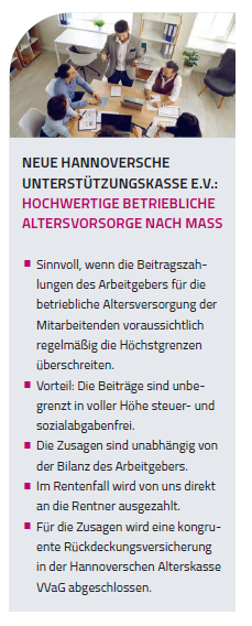 Für die Zukunft gehen wir davon aus, dass sich weitere Menschen und Unternehmen dazu entscheiden werden, sich für ihr Alter über die Neue Hannoversche Unterstützungskasse e.V. abzusichern.