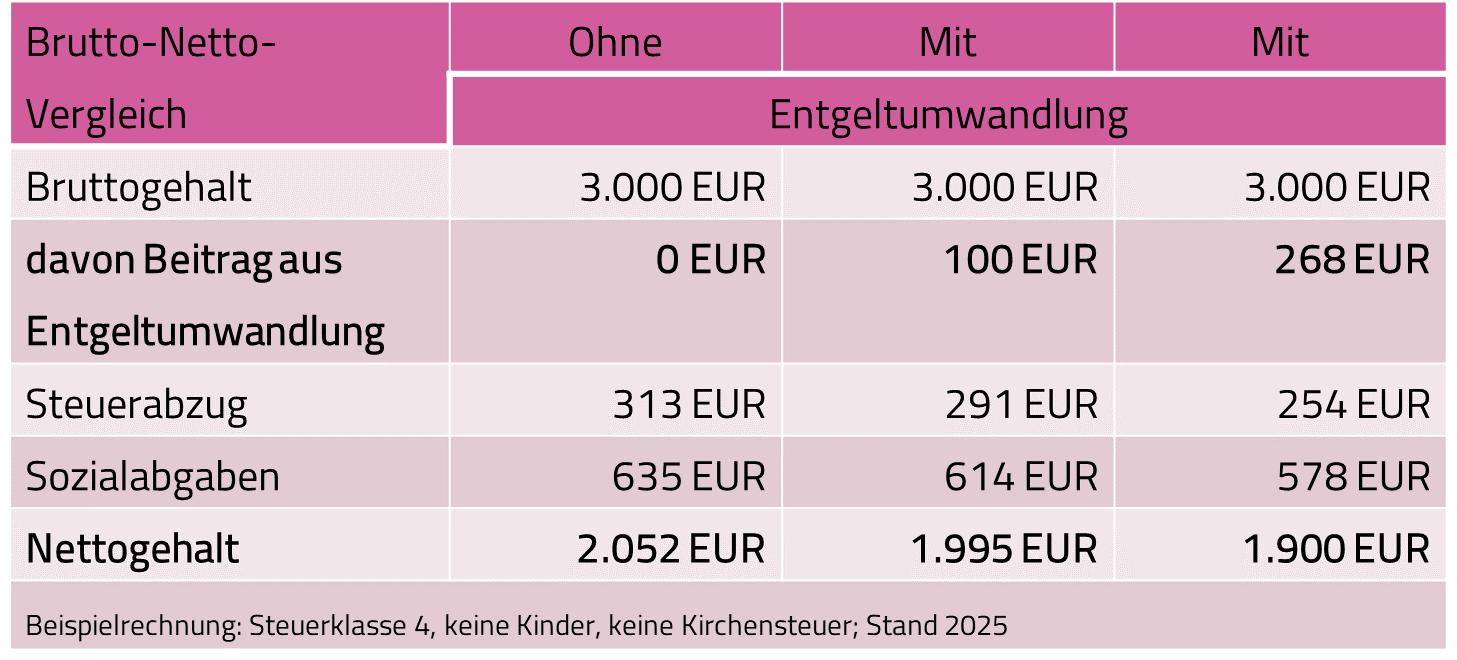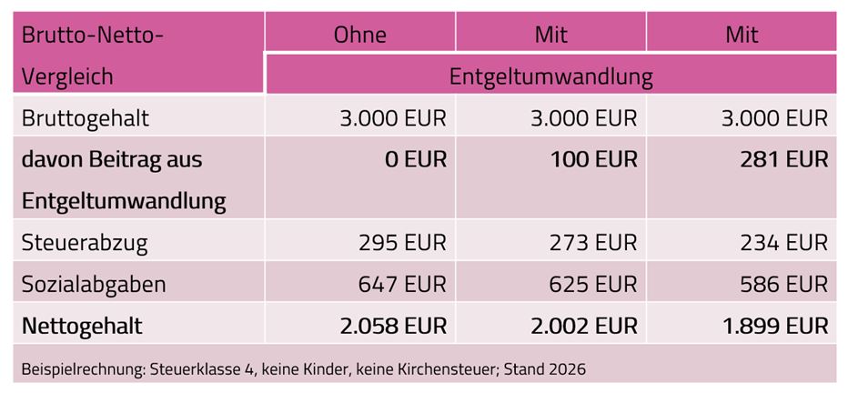 Der Vorteil dieses Modells liegt darin, dass durch einen geringen Verzicht auf Nettogehalt ein relativ großer Bruttobetrag für die Altersvorsorge verwendet werden kann. Das verdeutlicht auch folgende Beispielrechnung: